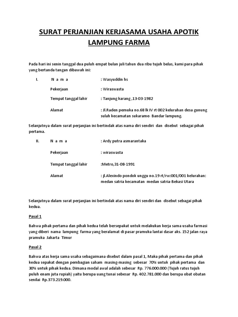 Contoh surat » surat perjanjian » contoh surat perjanjian kerjasama investasi modal usaha. Perjanjian kerja sama pemasaran barang. Berikut contoh langsung dari surat perjanjian kerjasama antara dua pihak. Kerjasama yang satu ini sudah sangat sering dilakukan oleh para pelaku usaha. Melihat dari manfaat dan isi surat perjanjian kerja sama usaha di atas, kita tentu sudah dapat menggambarkan poin apa saja yang harus dimasukkan dalam surat perjanjian kerjsa sama usaha. Contoh surat perjanjian kerjasama bagi hasil contoh surat. Surat perjanjian kerjasama bagi hasil usaha. Pada artikel kali ini masih ada satu. Bagi sahabat rumajamur yang akan melakukan perjanjian kerjasama dengan rekan kerja ataupun calon investor pastinya memerlukan draft surat akad yang isinya bisa mewakili kepentingan kedua belah pihak. Pihak kedua selaku pengelola modal dari pihak pertama bertanggungjawab untuk mengelola usaha sebagaimana tercantum dalam pasal 1 ayat 1. Pada hari ini, senin tanggal 2 januari 2019, di jakarta, yang bertanda tangan di bawah ini Pada hari ini, kamis tanggal dua bulan agustus, tahun dua ribu delapan belas (2 agustus 2018) bertempat di kota bandung, telah ditandatangani perjanjian kerjasama antara Contoh surat perjanjian kerjasama usaha perdagangan.